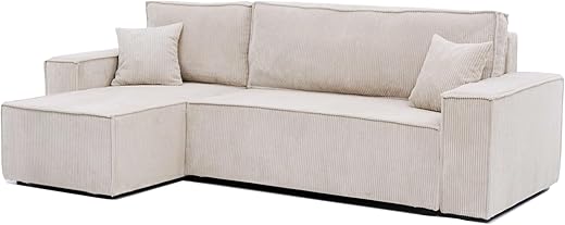 GREKPOL Narożnik rozkładany 244 x 145 Velours Côtelé po lewej lub prawej stronie – Sofa z miejscem do przechowywania – Sofa w kolorze beżowym – 3-osobowa rozkładana sofa – sofa łóżko – sofa…