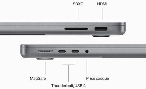 PODŁĄCZ, CO CHCESZ — ten MacBook Pro ma port ładowania MagSafe, dwa porty Thunderbolt/USB 4, czytnik kart SDXC, port HDMI i gniazdo słuchawkowe. A dzięki Wi-Fi 6E i Bluetooth 5.3 możesz cieszyć się płynną łącznością bezprzewodową. Obsługa zewnętrznego wyświetlacza. (Wi‑Fi 6E dostępne w krajach i regionach, które obsługują tę technologię).