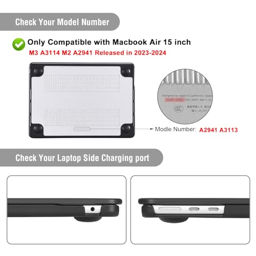 ✔️ Kompatybilne wyłącznie z MacBookiem Air 15 M2 M3 2024 2023 z ekranem Liquid Retina 15,3″ i Touch ID (model: A2941, A3114, wprowadzony na rynek w latach 2023-2024). Przed zakupem sprawdź numer modelu „AXXXX” z tyłu MacBooka. Nasz zestaw ochronny do MacBooka Air 15 m2/m3 nie pasuje do MacBooka Air 13/13,3 13/13,6 cala.