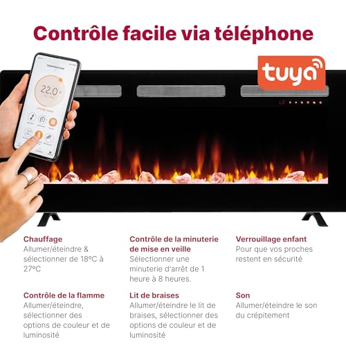 STEROWANIE KOMINKEM ELEKTRYCZNYM: Podłącz kominek elektryczny do smartfona przez Bluetooth za pomocą aplikacji Tuya Smart. Kominkiem można sterować za pomocą wyświetlacza na kominku.