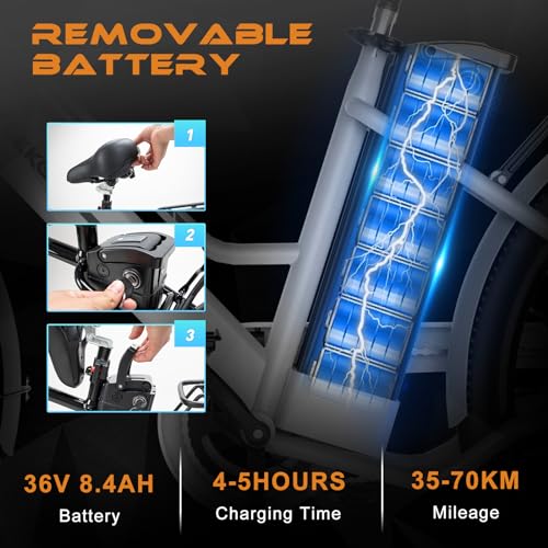 Wyjmowana bateria: Największą zaletą naszego e-roweru jest wyjmowana bateria litowo-jonowa o pojemności 8,4 Ah, którą można ładować oddzielnie i która jest łatwa w transporcie. Bateria jest dostarczana z oddzielnym mechanicznym zabezpieczeniem antykradzieżowym i kluczem do baterii. Czas ładowania baterii wynosi od 4 do 5 godzin.