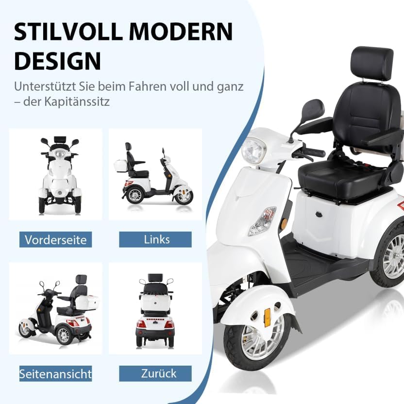 Skuter z napędem na 4 koła waży 225 kg i zapewnia zarówno dorosłym, jak i osobom starszym najwyższy poziom komfortu, wygody i swobody poruszania się.
