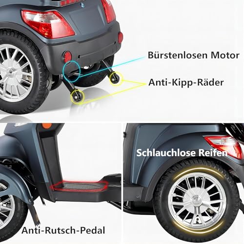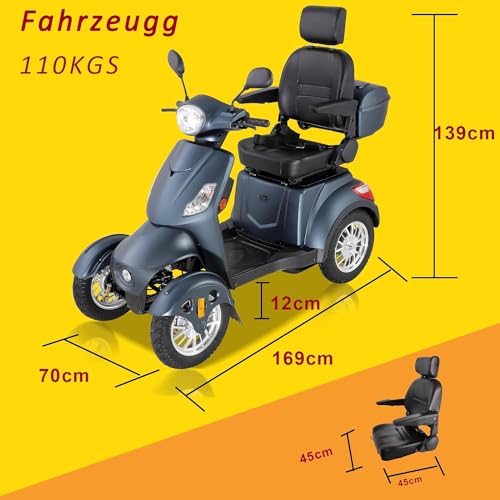 Skuter z napędem na 4 koła waży 225 kg i zapewnia zarówno dorosłym, jak i osobom starszym najwyższy poziom komfortu, wygody i swobody poruszania się.