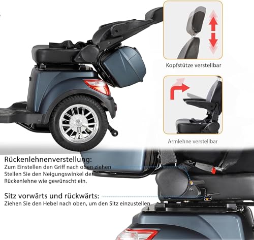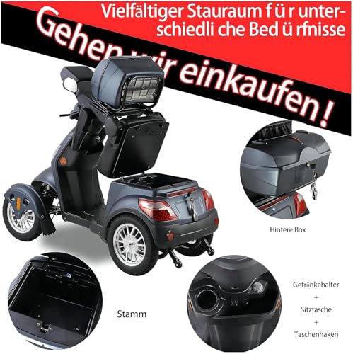 Elektryczny skuter z 4 kołami, 3 prędkościami, dużą przestrzenią bagażową, regulowaną głowicą i podłokietnikami oraz oparciem. Nadaje się do różnych terenów, wyposażony w reflektory, tylne światła i…