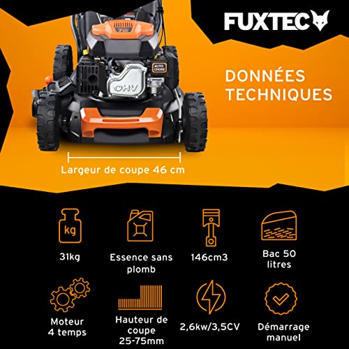 FUXTEC Kosiarka spalinowa z napędem samobieżnym FX-RM4646 – Easy Clean 4 w 1 Napęd tylny z funkcją mulczowania Szerokość koszenia 46 cm – pojemność kosza 50 l