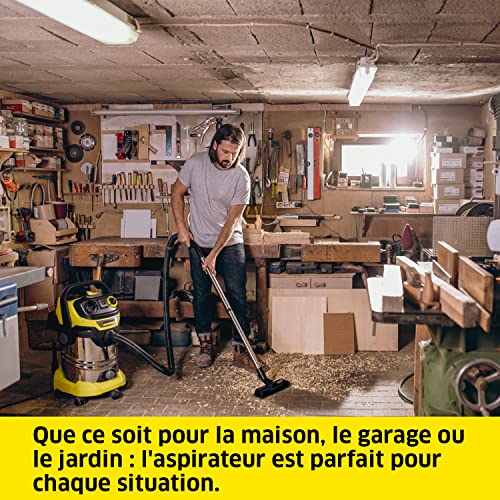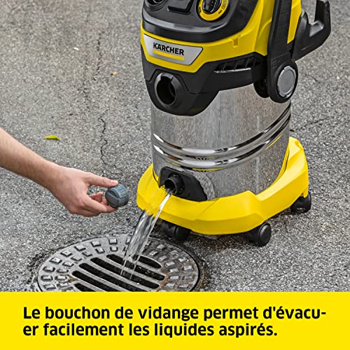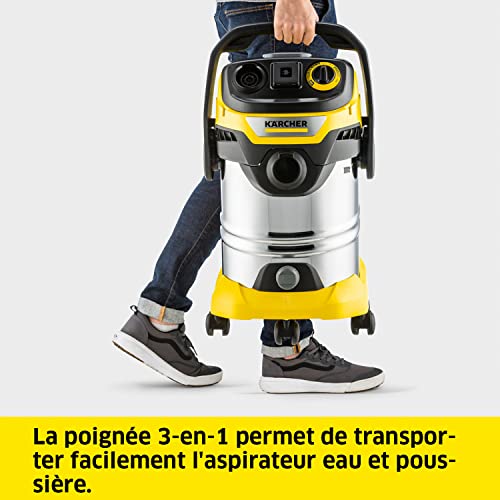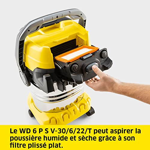Odkurzacz do wody i kurzu WD 6 P S V-30/6/22/T: odkurza suchy i mokry kurz, posiada funkcję dmuchawy. Zbiornik stalowy o pojemności 30 l, płaski filtr harmonijkowy, wąż o długości 2,2 m i schowek na przewody. Wszechstronny do użytku w domu, garażu, na tarasie i w samochodzie. W zestawie: kompletne akcesoria.