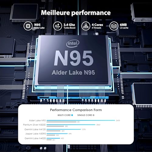 【Wysoka wydajność】Ten laptop jest wyposażony w czterordzeniowy procesor In-tel 12. generacji N95, działający pod kontrolą profesjonalnego systemu operacyjnego Win 11 z maksymalną częstotliwością turbo 3,4 GHz, zapewniającym wyższą wydajność w porównaniu z N5095/N4120/J4105. Jego szybka pamięć podręczna 6M i niezawodna wydajność z łatwością radzą sobie z takimi zadaniami, jak przetwarzanie dokumentów, przeglądanie stron internetowych i lekkie wielozadaniowość, zapewniając płynne działanie podczas pracy, nauki i rozrywki.