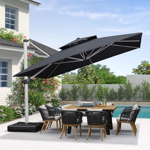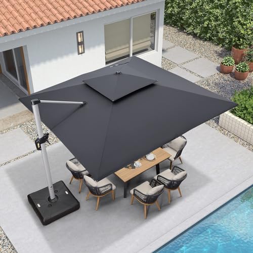 PURPLE LEAF Parasol z wysięgnikiem 3,65 x 3,65 m kwadratowy z podstawą, luksusowy parasol ogrodowy z podwójnym dachem i pokrowcem ochronnym, stalowoszary