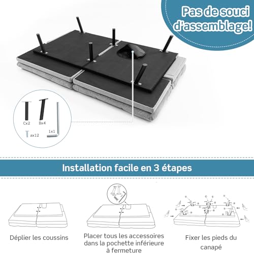 ★MONTOWANIE W 3 KROKACH★Rozkładana sofa futon nie wymaga specjalistycznego montażu i można ją zainstalować w zaledwie 3 krokach: rozłóż poduszki, znajdź wszystkie akcesoria w dolnej kieszeni zapinanej na zamek błyskawiczny, a następnie zamocuj nóżki sofy. W razie potrzeby można wytrzeć kurz i utrzymać sofę w czystości za pomocą miękkiej ściereczki.