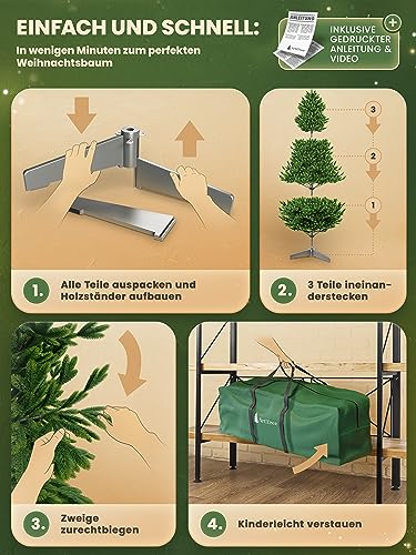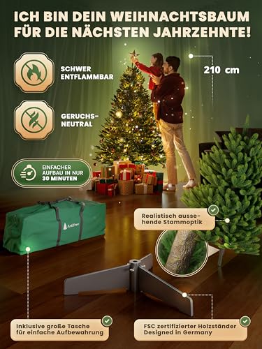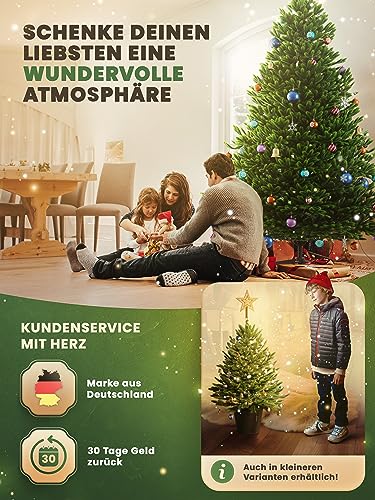 Niezawodna i stabilna: nasza choinka jest bezpieczna i stabilna dzięki niemieckiej konstrukcji. Choinka jest wykonana z materiałów ognioodpornych, jest bezpieczna dla kotów i gwarantuje harmonijny okres świąteczny dla zwierząt domowych i rodziny. Twoja sztuczna choinka została dokładnie przetestowana.