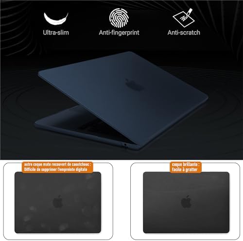 𝗖𝗢𝗥𝗥𝗘𝗦𝗣𝗢𝗡𝗗𝗥𝗘 𝗟𝗔 𝗖𝗢𝗨𝗟𝗘𝗨𝗥 𝗢𝗙𝗙𝗜𝗖𝗜𝗘𝗟𝗟𝗘 Dwuczęściowe sztywne etui. Brak wycięcia na logo na górnej pokrywie. Antypoślizgowe gumowe nóżki utrzymują MacBook Air 13 6 cali 2024 2022 stabilnie na gładkim stole. Cienkie, półprzezroczyste, matowe wykończenie w kolorze midnight jest idealne dla MacBooka Air M3 A3113 / M2 A2681 w kolorze midnight, jest prawie niewidoczne i doskonale oddaje oryginalną fakturę koloru urządzenia.