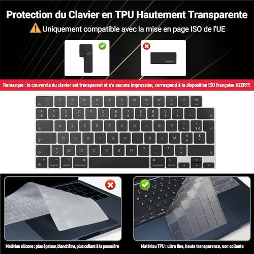 ⌨️ 𝗣𝗥𝗢𝗧𝗘𝗖𝗧𝗜𝗢𝗡 𝗗𝗘 𝗖𝗟𝗔𝗩𝗜𝗘𝗥 𝗨𝗘 Przezroczysta nakładka na klawiaturę-joint ma układ UE AZERTY, jest wykonana z materiału TPU o wysokiej przepuszczalności, ultra cienkiego do 0,12 mm, dzięki czemu podświetlenie jest wyraźnie widoczne, skutecznie chroni przed zabrudzeniami i tłuszczem, można ją myć i używać wielokrotnie.