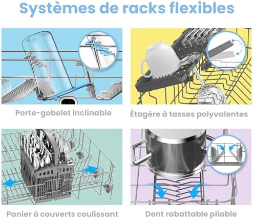 [Elastyczne wsporniki] Załadunek staje się dziecinnie prosty dzięki systemowi elastycznych wsporników z odchylanymi zaczepami. Zmywarka posiada również wyjmowany kosz na sztućce i wszechstronną szufladę na filiżanki. Dzięki temu masz więcej miejsca na talerze, garnki lub większe miski.